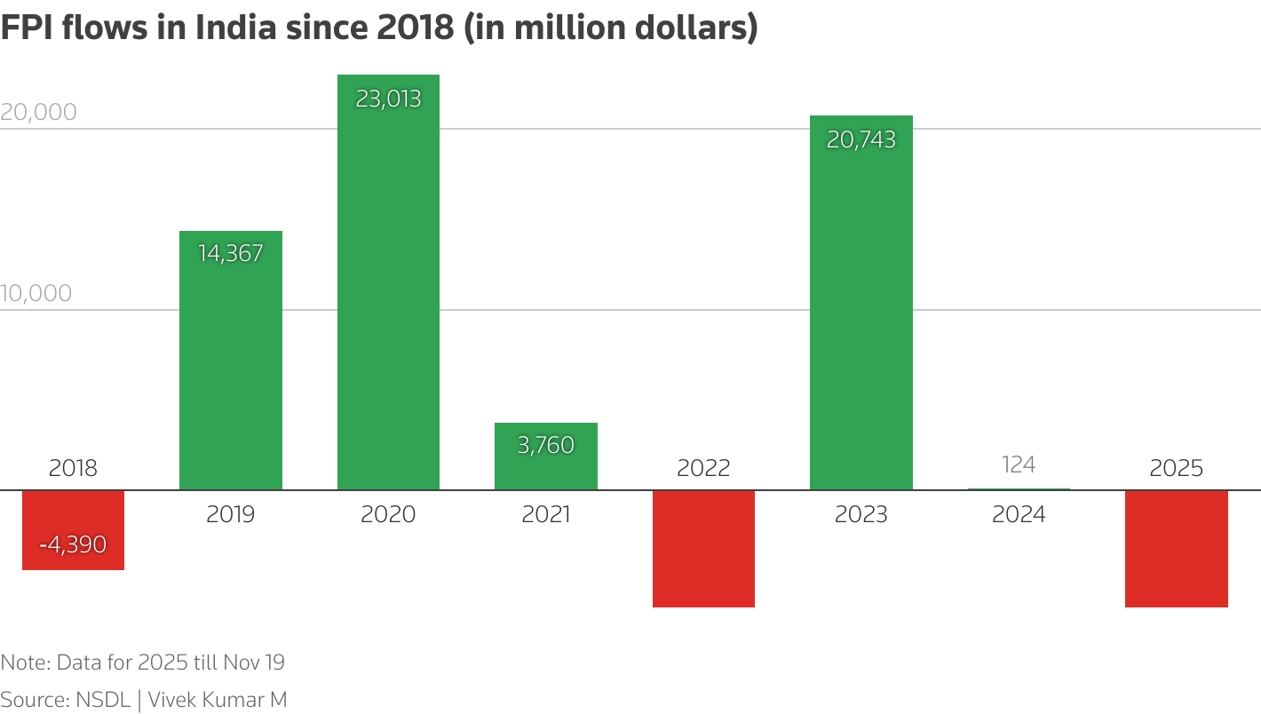11月21日(路透社) - Amundi (AMUN.PA),欧洲最大的资产管理公司,预计外国投资者将重返印度股票市场,因为2025年的大量抛售开始减缓,这导致全球增长最快的主要经济体表现不及其他新兴市场。外国投资者今年迄今已出售164亿美元的印度股票,标志着他们的第二大流出记录,尽管国内机构买家以770亿美元的购买量介入。