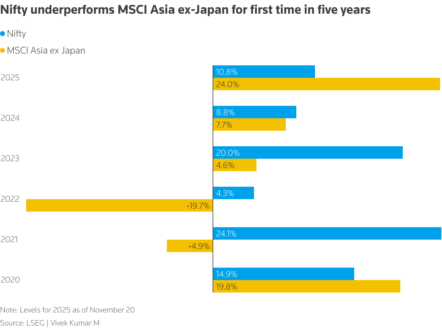 Nifty首次在五年内表现不及MSCI亚太(不包括日本)