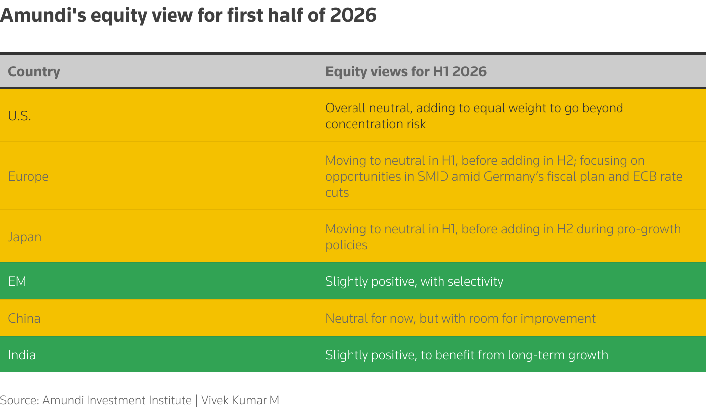 阿蒙迪对2026年上半年印度及更广泛的新兴市场股票保持“略微积极”的态度,同时对中国、日本和美国股票持“中性”立场。