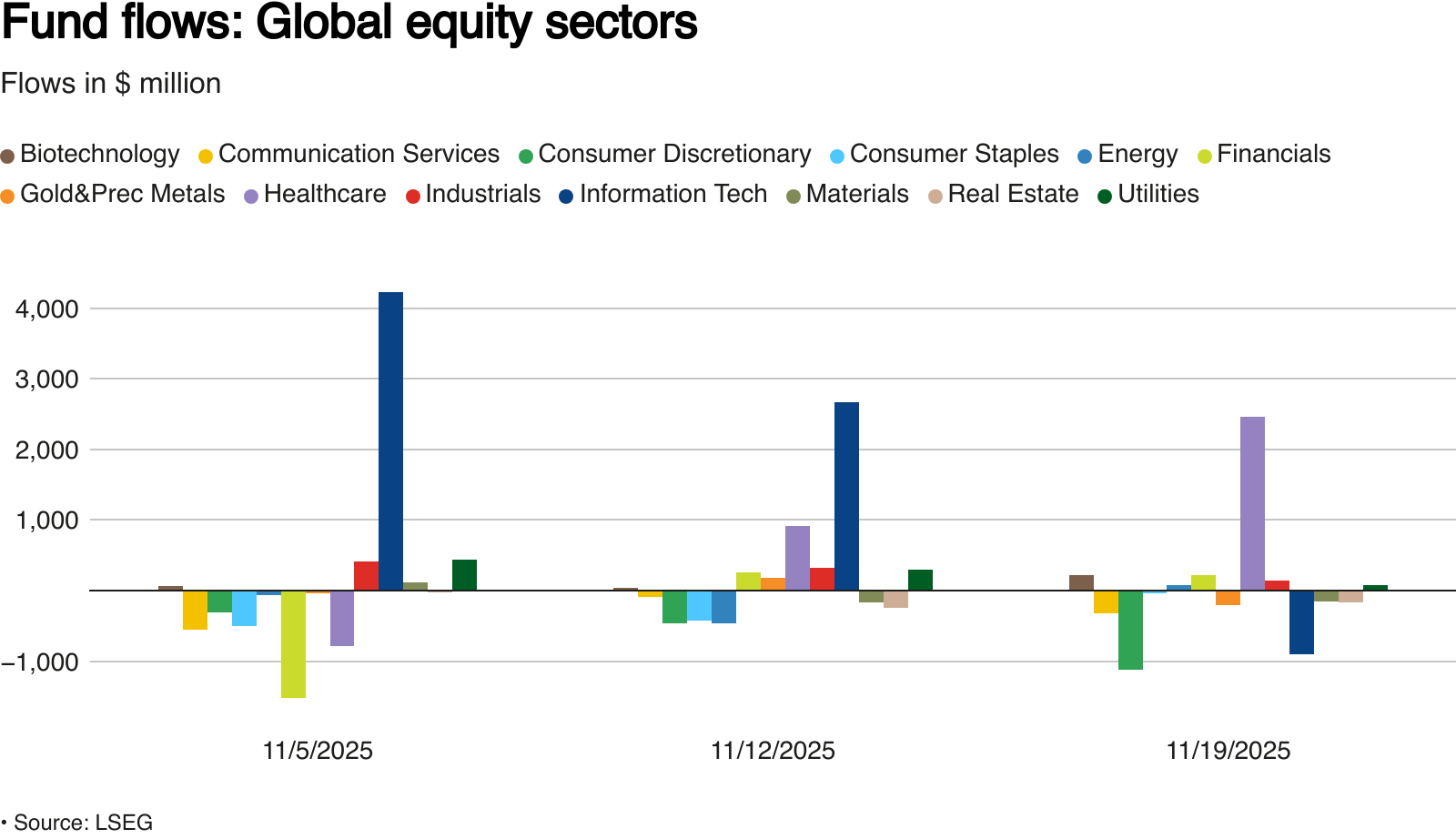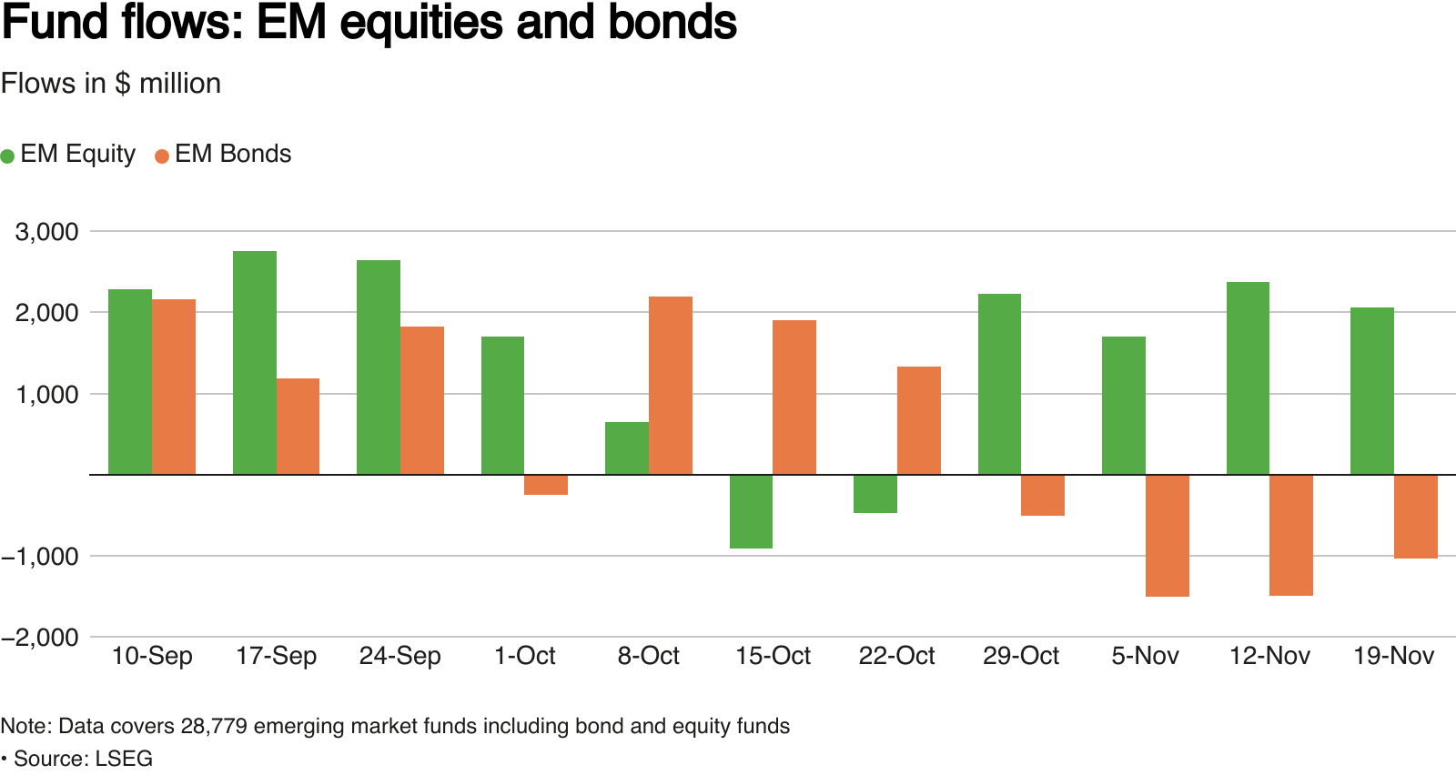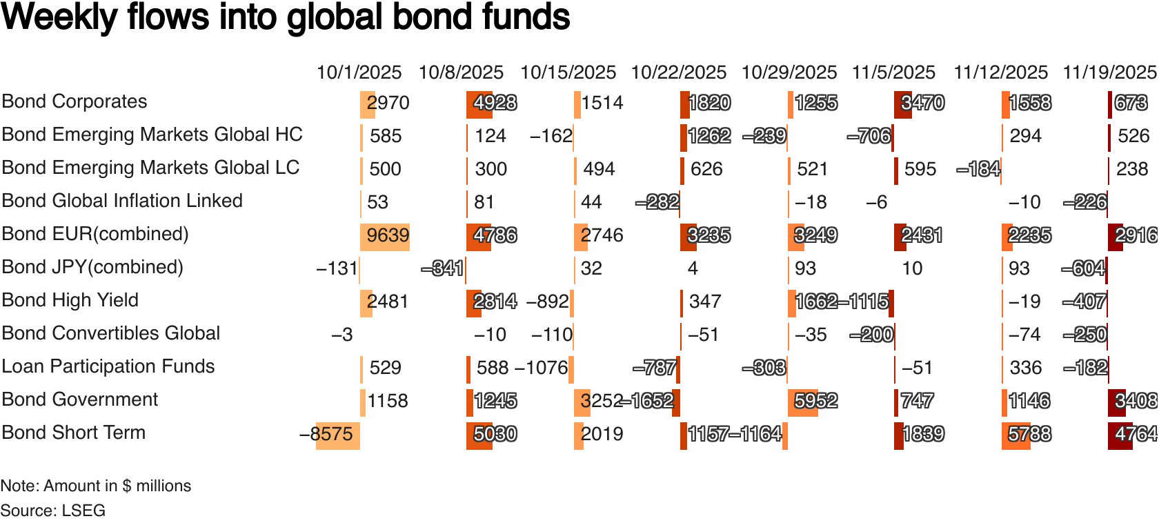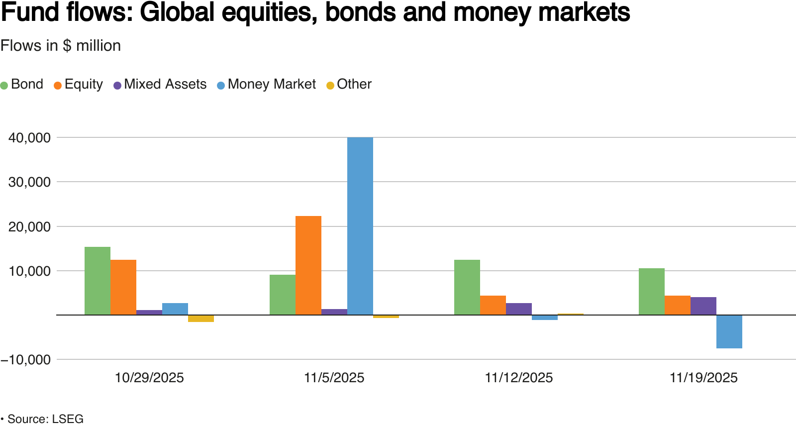 LSEG Lipper数据显示,截至11月19日的一周,投资者净购买了价值44.3亿美元的全球股票基金,略高于前一周的43.9亿美元。