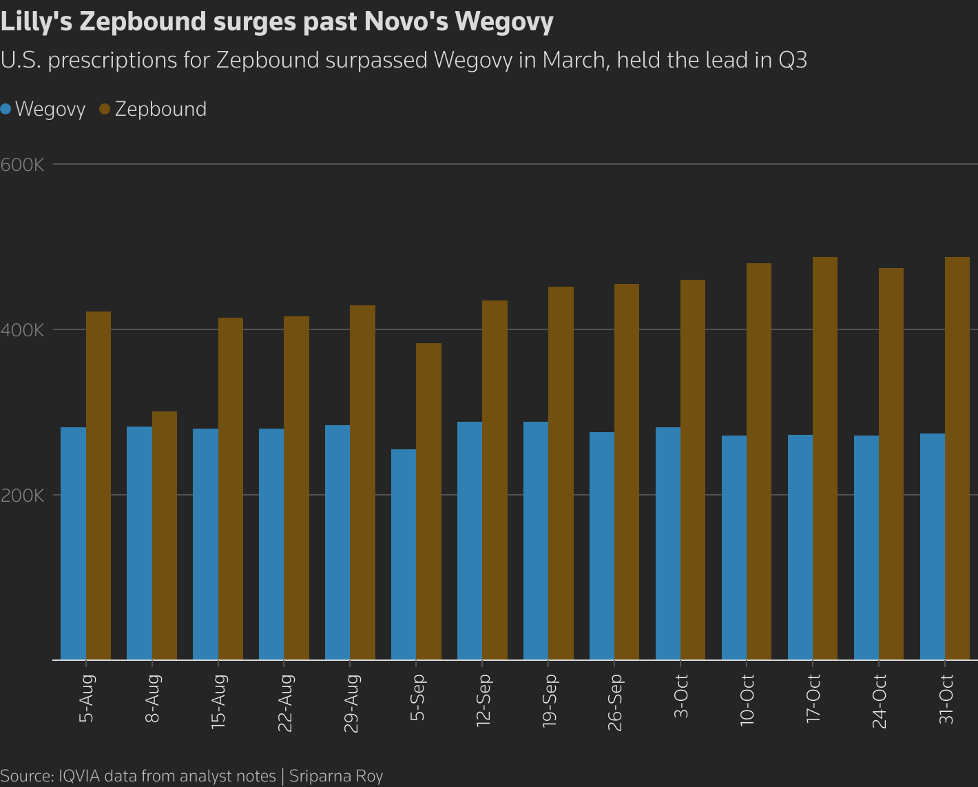 礼来公司的Zepbound在美国处方中超越了诺和诺德的Wegovy,保持了第三季度的领先地位
