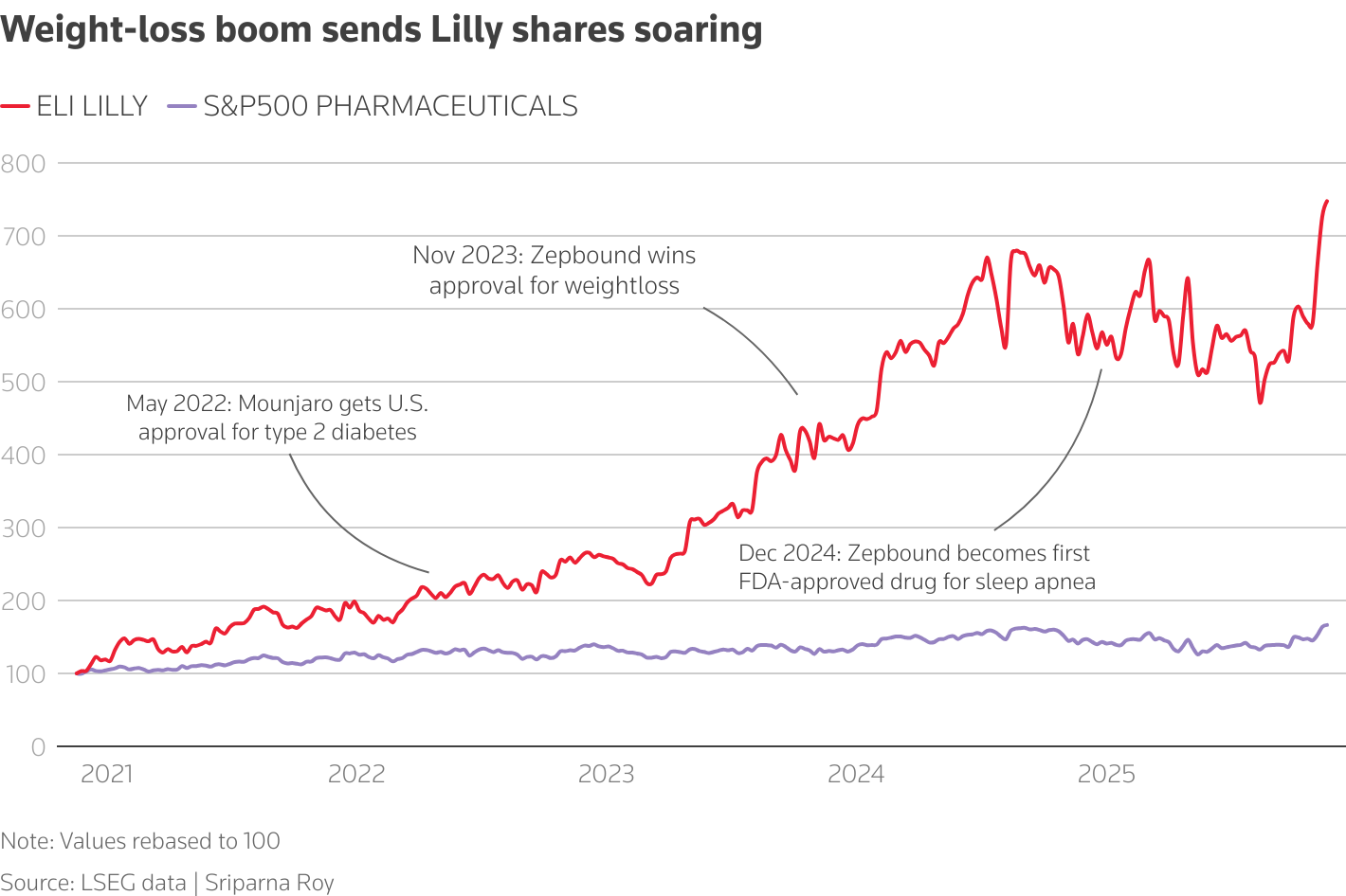 自2023年底Zepbound推出以来,礼来公司的市值上涨超过75%,而标准普尔500指数在同一时期上涨超过50% (.SPX),这是美国股市的一个参考指标。