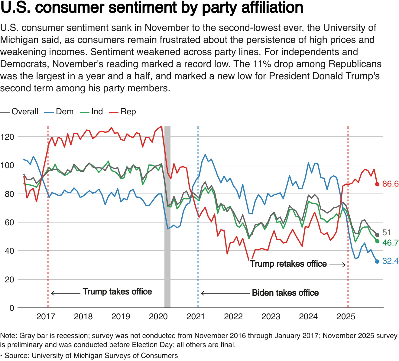 对于独立选民——任何党派赢得全国选举希望的关键选民——11月创下历史最低点。即使是共和党人也感到不满,记录了18个月以来信心的最大下降。