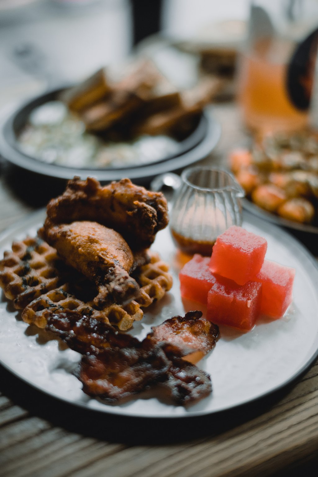 Blue Supreme餐厅的酪乳炸鸡华夫饼配烟熏培根、芥末籽枫糖浆和金巴利西瓜。图片来源:资料图片
