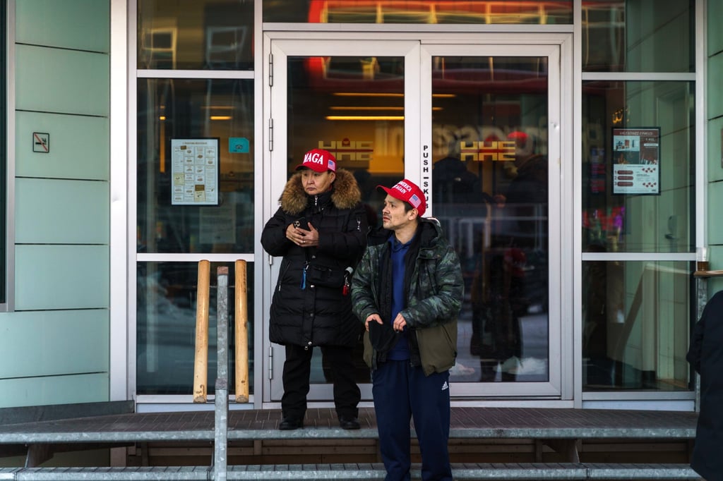 1月12日周二,小特朗普访问格陵兰努克期间,戴着MAGA帽子的居民站在汉斯·埃格德酒店前。图:EPA-EFE