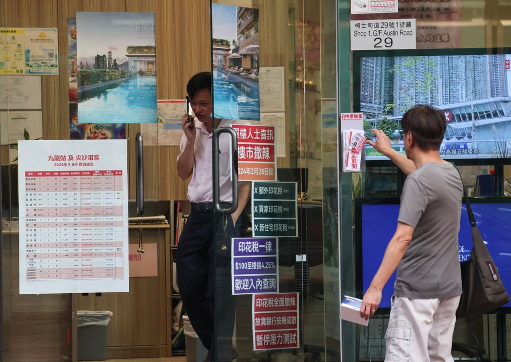 2024年10月18日,香港佐敦某地产中介张贴的住宅楼盘广告。摄影:Jelly Tse