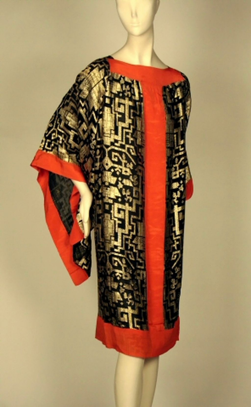纽约市博物馆展出的1920年代黑色雪纺绸礼服,饰有金线几何纹锦缎和红色丝绸绉纱。照片:美联社