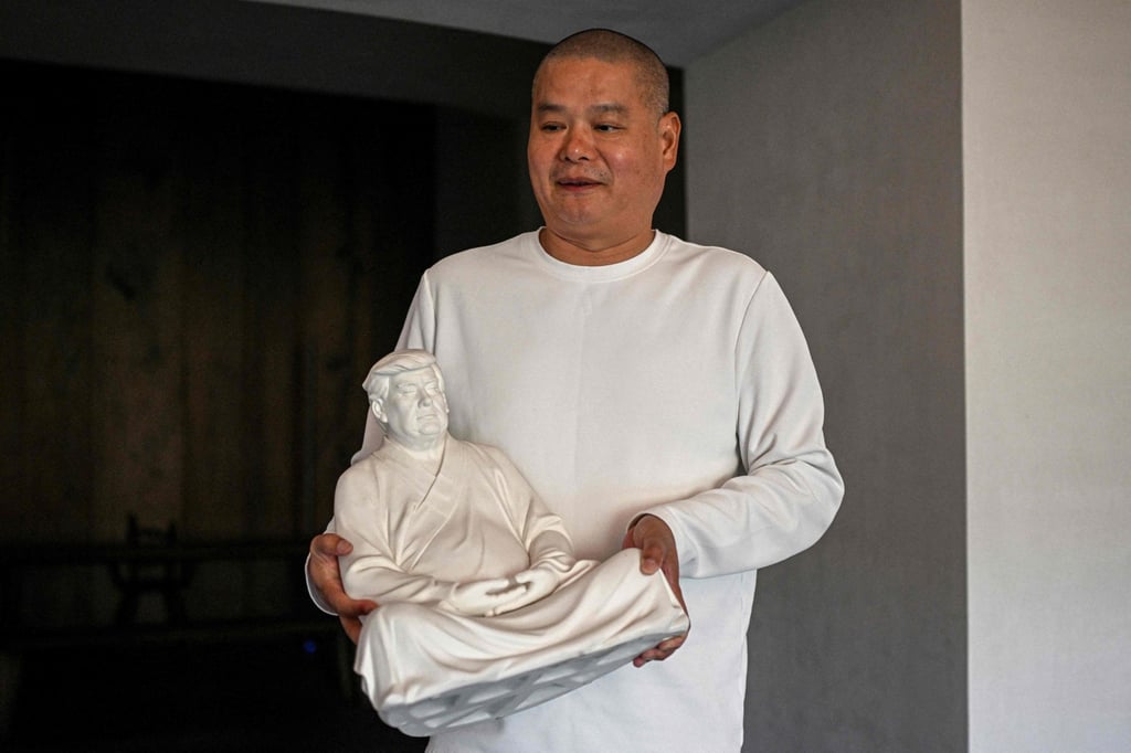 这个半闭双目、双腿盘坐的陶瓷雕像,其姿态令人联想到佛陀,原型正是美国那位充满争议的候任领导人,出自设计师兼雕塑家洪金仕之手。这位令美国社会分裂的候任领袖的陶瓷形象,是设计师兼雕塑家洪金仕的作品。这些充满禅意的雕像——根据尺寸不同,洪金仕以999元至2万元人民币(135至2700美元)的价格出售——最初在2021年通过电商平台淘宝走红,引发全国媒体报道。淘宝由《南华早报》母公司阿里巴巴集团运营。