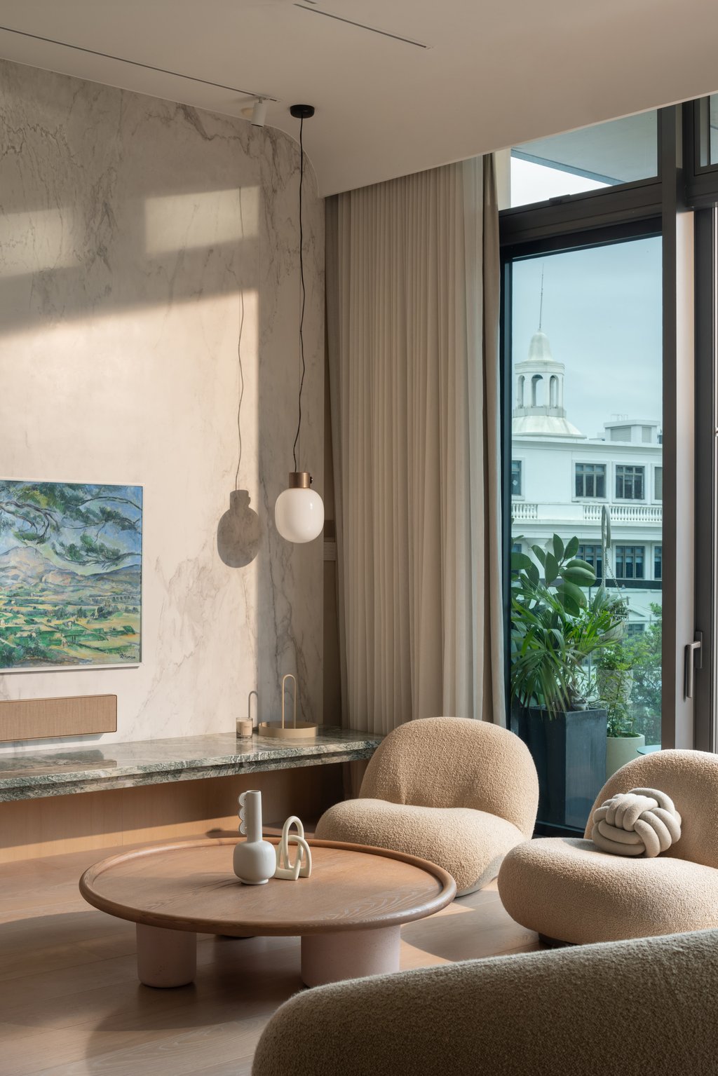 “我们本可以把夹层做得更大,像某些客户可能想充分利用整个区域那样,”Faure指出,“但这关乎创造流畅的动线,并享受双层挑高空间带来的自然光线和通透感。”