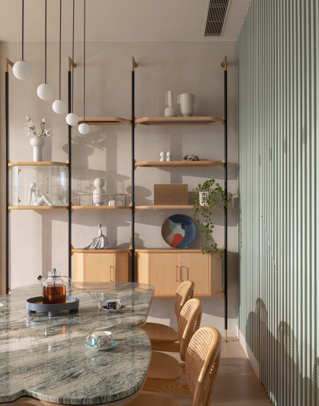 餐桌采用Bean Buro设计的青铜金属与木质底座,配有大理石台面。摄影:Steven Ko