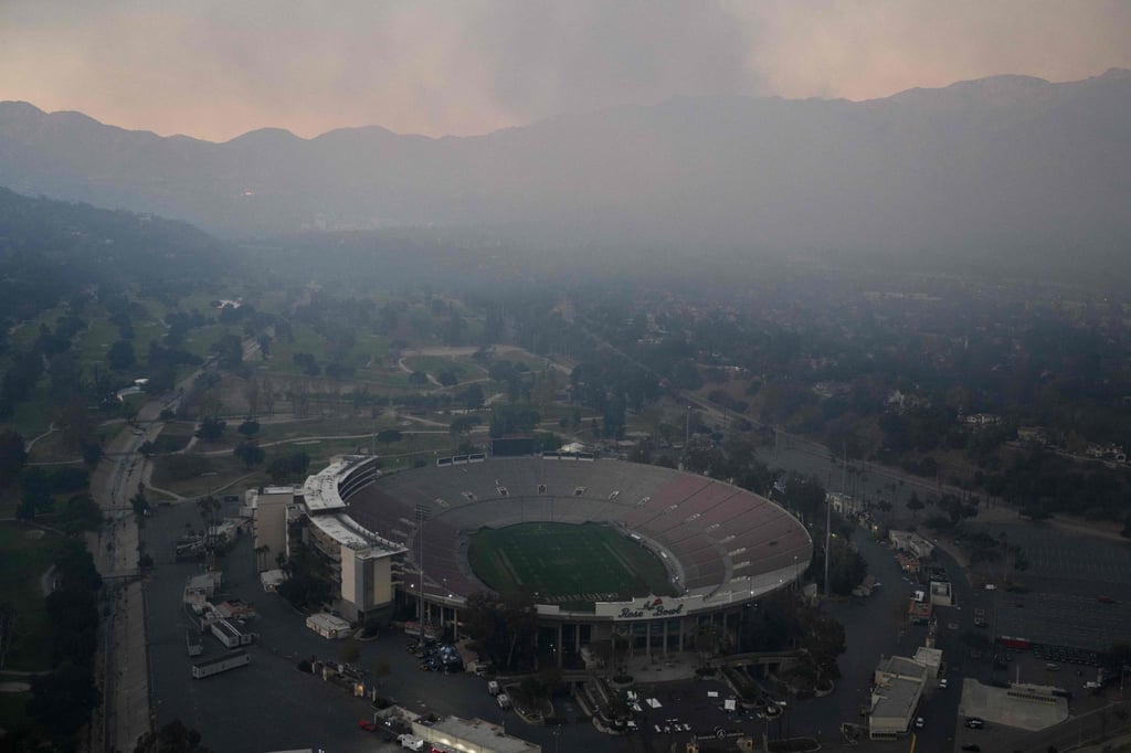 1月8日,烟雾笼罩着将承办2028年奥运会足球赛事的玫瑰碗体育场。图片来源:法新社
