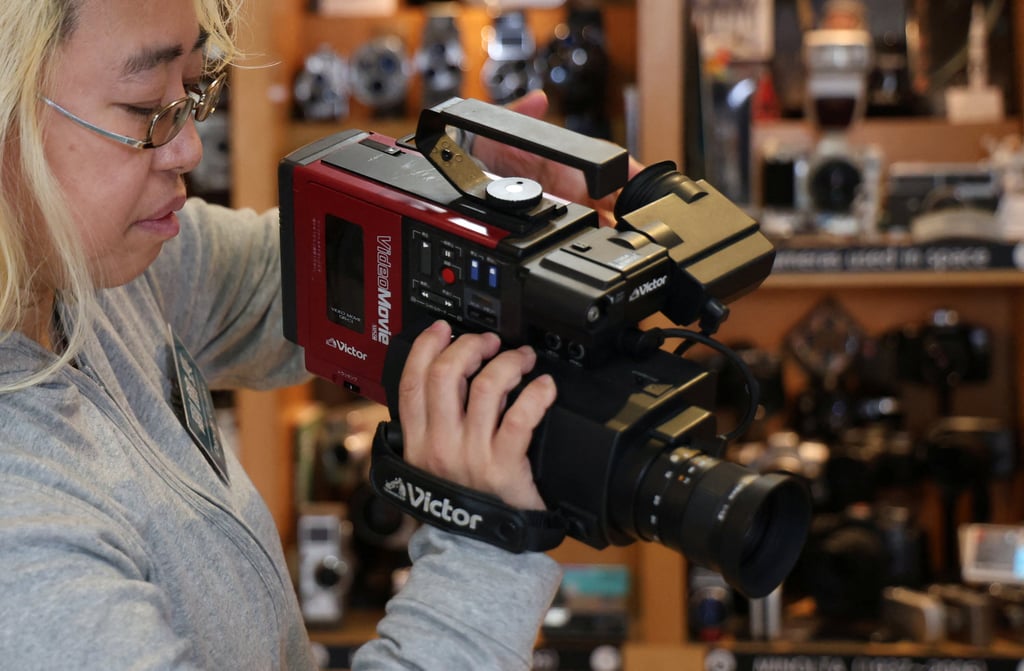 副馆长浅香芭芭拉手持东京灭绝媒体博物馆展出的VHS-C录像带式摄像机。图源:路透社
