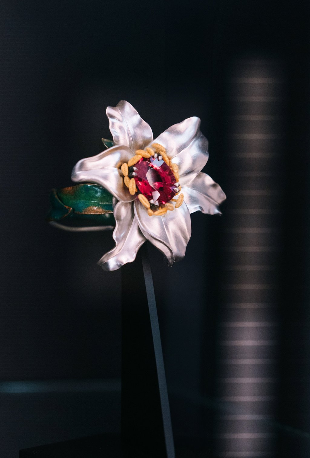 《梦幻白百合》手镯将诗意浪漫与花卉写实交织,中央镶嵌30.48克拉天然红碧玺,水晶灌注的黄色珐琅花蕊与银质花瓣交相辉映。金银合金打造的弧形花茎环抱手腕。创作灵感源自清代恽寿平工笔花卉与舒曼声乐套曲《诗人之恋》。大英博物馆策展人杰西卡·哈里森-霍尔盛赞其堪比19世纪宫廷珠宝。