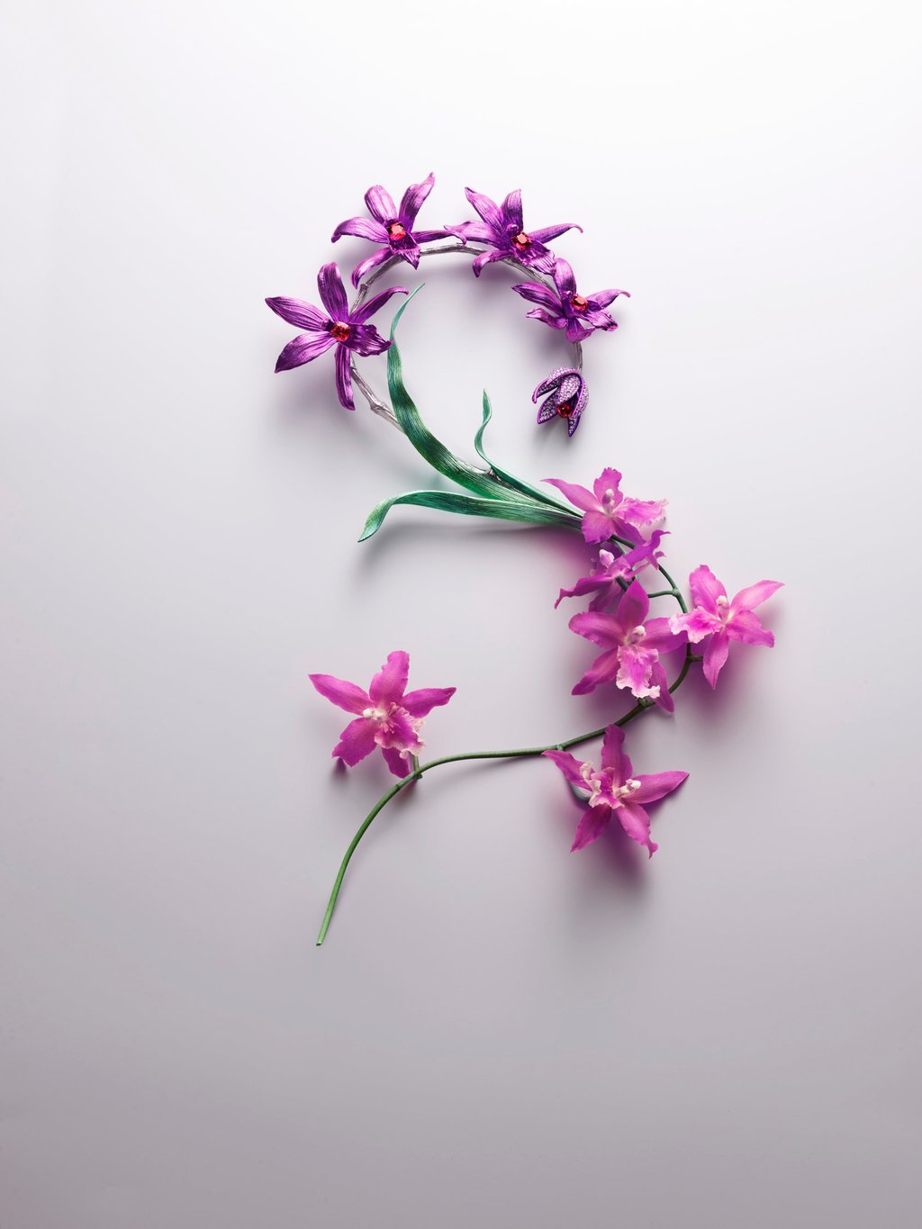 继波士顿美术馆收藏《绮丽安娜》胸针后,大英博物馆的此次收藏再次印证胡茵菲艺术成就获得的国际认可。该胸针以自然主义珠宝语言结合大型设计与新型材料,向张大千《兰花图》致意——钛金属手工锻造的柔美花瓣,尖晶石点缀的花蕊,叶片造型蕴含中国书法笔意。