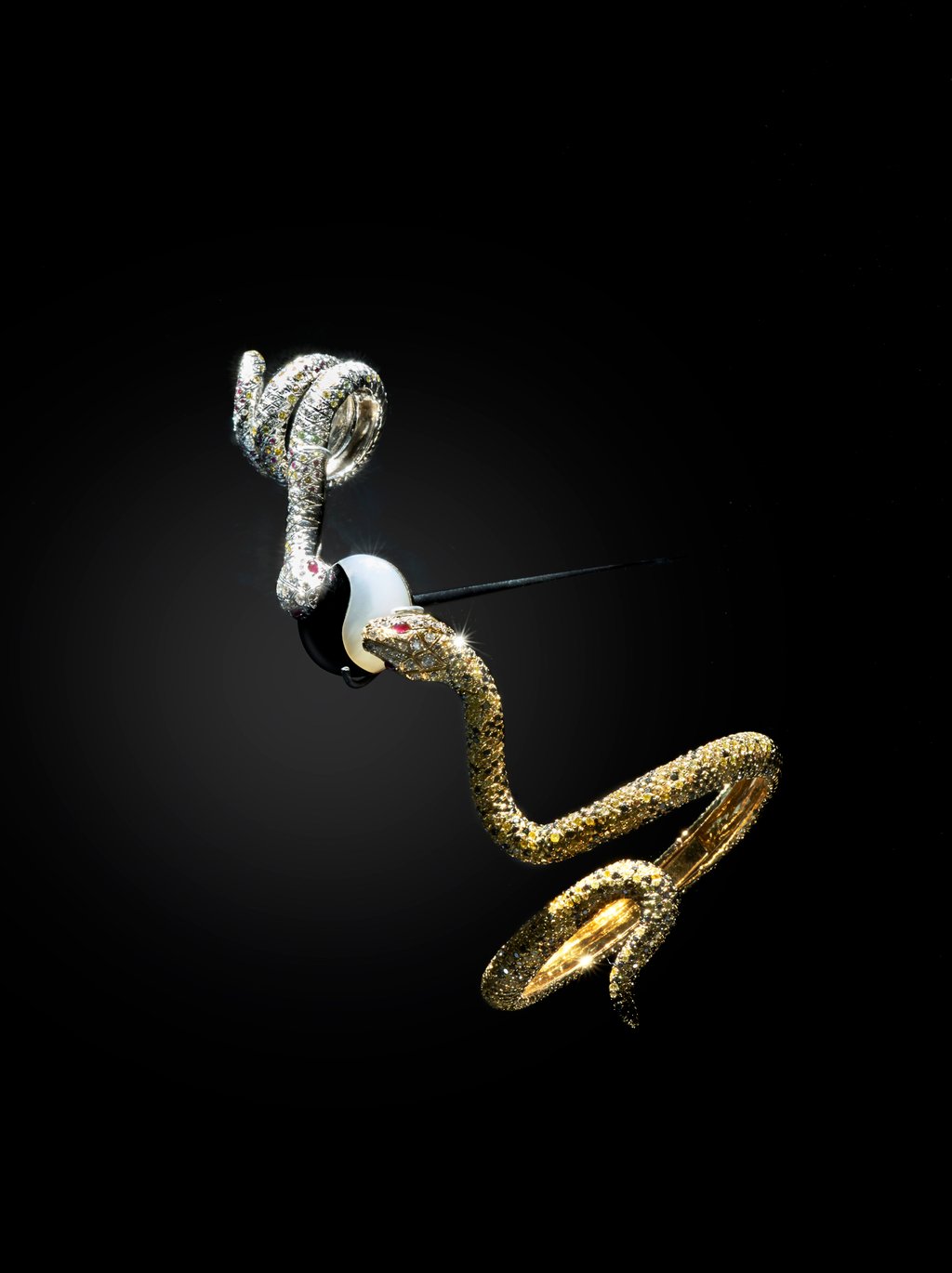 两年前,胡那款大胆华丽的"阴阳"手饰被巴黎装饰艺术博物馆纳入永久馆藏。这件2010年为美国艺术家辛迪·舍曼特别创作的关节式作品,以两条镶嵌宝石的灵蛇——象征东西方——相互凝视,在缠绕手腕时咬住一枚黑玛瑙与白珍珠母贝制成的太极石。