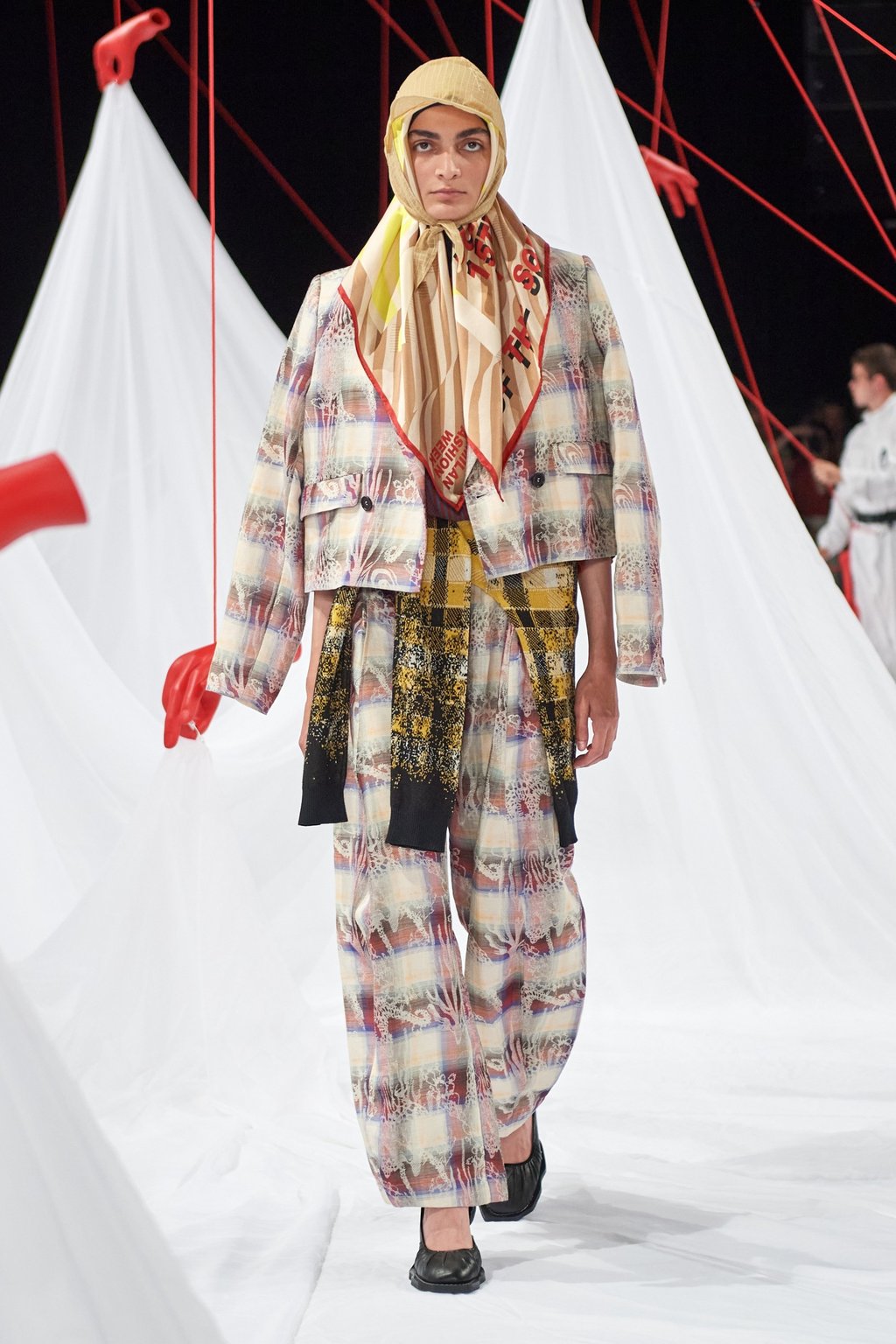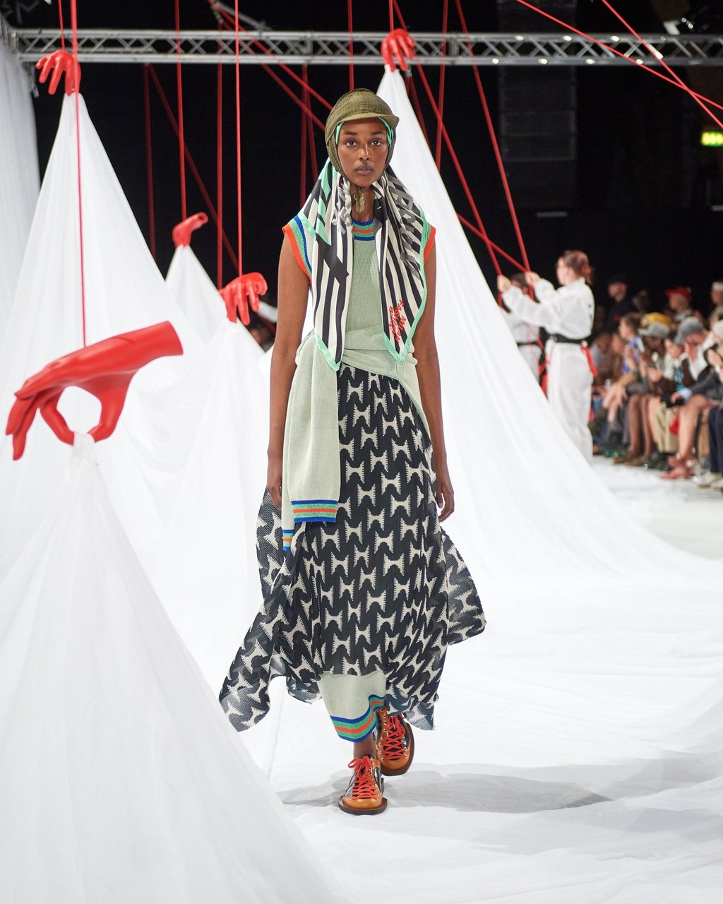 “[他们问]‘能私下交谈吗?‘我说’不太行,因为开着扬声器呢’,“维布斯科夫笑着讲述发现腾不出手接电话时的混乱思绪。这场名为《温柔援助乐团》的秀场最终以数十只悬浮的红色傀儡手作为视觉核心。“这个柔软的概念是说——当你陷入困境时,我们必须更擅长相互扶持。共情力至关重要,“他解释道。