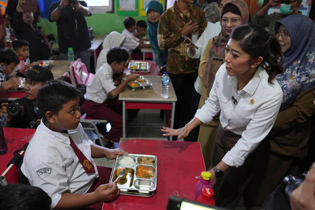 1月6日,印度尼西亚通信部长梅蒂亚·哈菲德(右)在总统普拉博沃·苏比安托为儿童和孕妇推出的免费餐计划启动仪式上与学生们交谈。图片来源:美联社