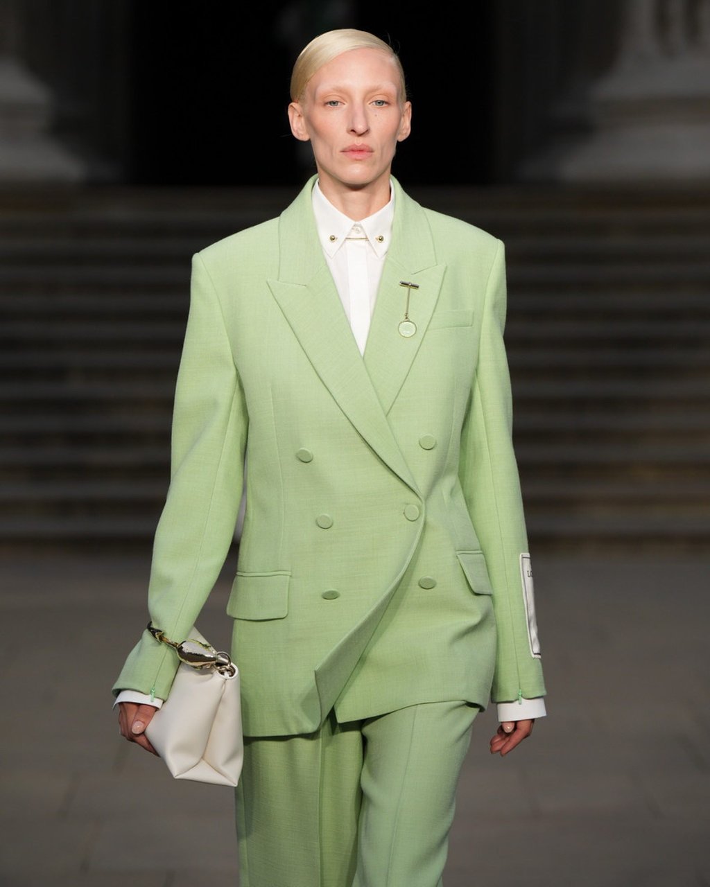 “这个系列探索了男性化的剪裁与女性化的裙装,两者之间存在一种推拉关系,”莫拉里奥格鲁这样描述该系列,其中还包括淡绿色和泡泡糖粉色的双排扣西装。