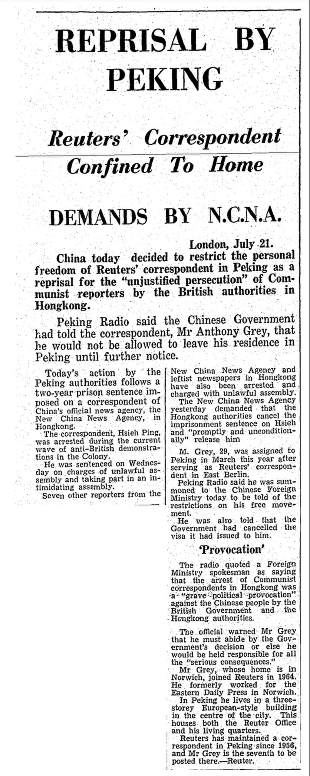 “中国今日决定限制路透社驻北京记者的个人自由,以报复英国当局在香港对共产党记者的‘无理迫害’,”《南华早报》在1967年7月22日报道称。“北京电台表示,中国政府已告知该记者安东尼·格雷先生,在另行通知之前,他不得离开在北京的住所。“北京当局今日的行动是对中国官方新闻机构新华社一名驻香港记者被判处两年监禁的回应。该记者谢平是在殖民地当前的反英示威浪潮中被捕的。他于周三因非法集会和参与恐吓性集会的指控被判刑。