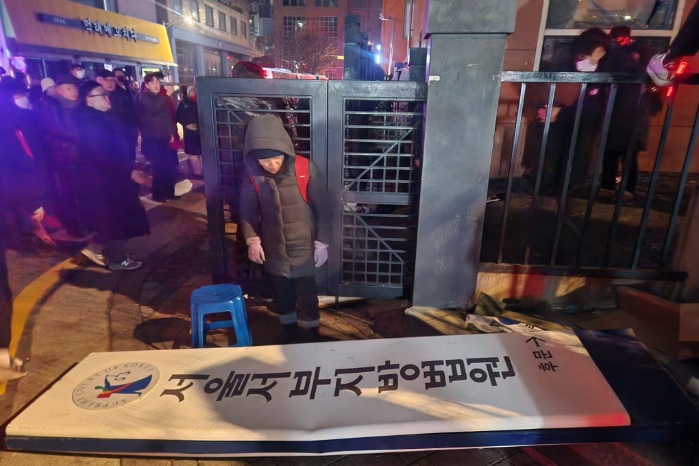 抗议者高呼尹锡悦的名字和“撤销逮捕令”等口号,拆毁法院标牌、践踏标语、翻越围栏并打碎窗户。