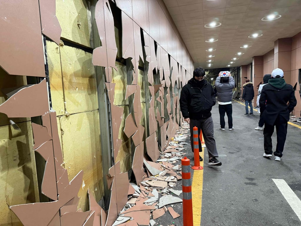 周日,遭弹劾的韩国总统尹锡悦的支持者走过首尔西部地方法院被毁坏的墙壁。照片:法新社