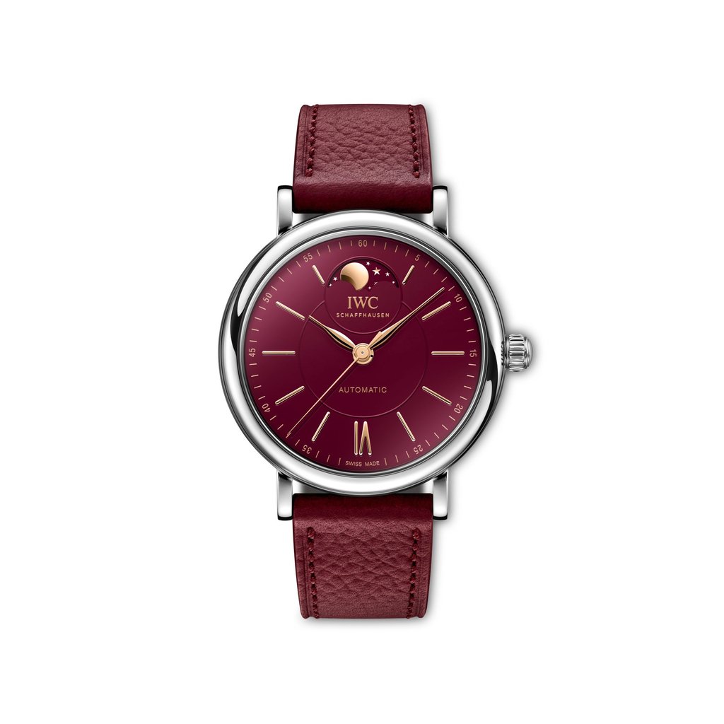 这款IWC万国表柏涛菲诺自动月相37蛇年特别款采用不锈钢表壳搭配祥瑞勃艮第红表盘,表背精心装饰有镀金蛇形摆陀。