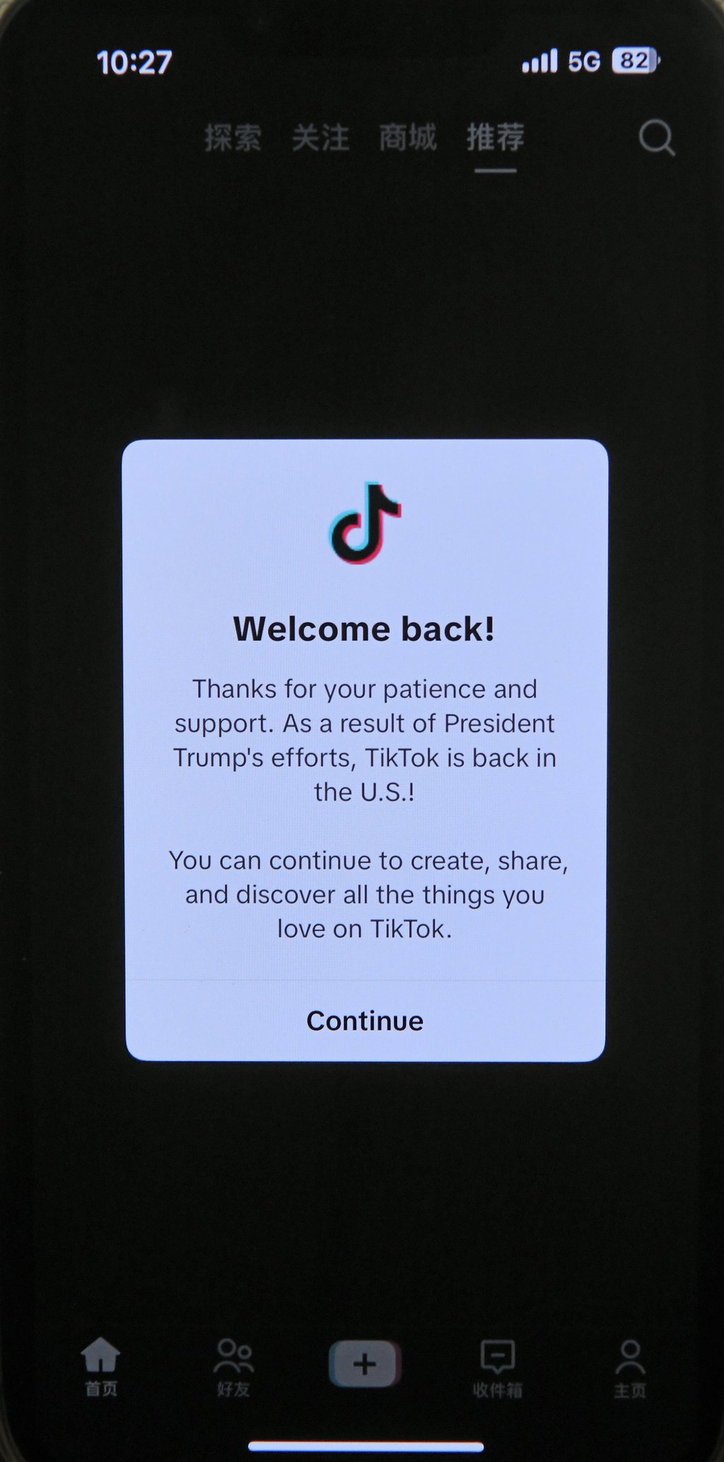 TikTok在周日短暂关闭后恢复美国运营时,在致用户声明中称赞了唐纳德·特朗普。该公司将此次关闭归咎于要求字节跳动剥离该应用的法律。图片来源:新华社