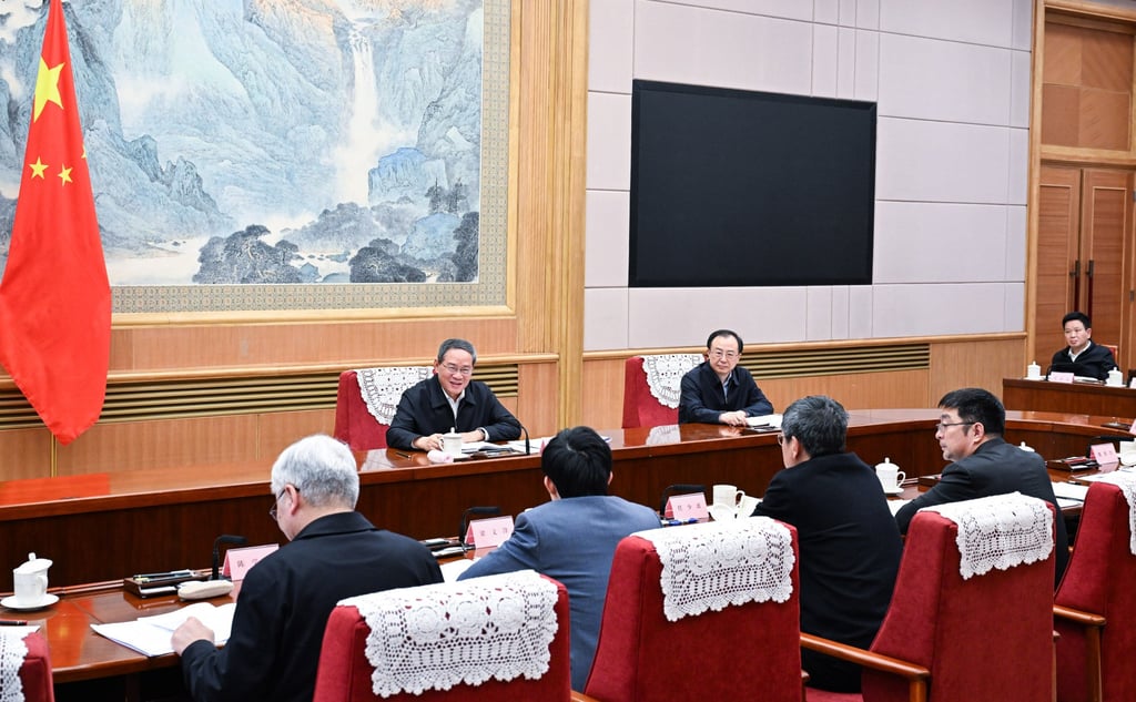 周一在北京召开的座谈会上,中国国务院总理李强(左二)与深度求索创始人梁文锋直接对坐,听取科技、教育、科学、文化、卫生和体育等领域行业人士对政府工作报告草案的意见建议。图:新华社