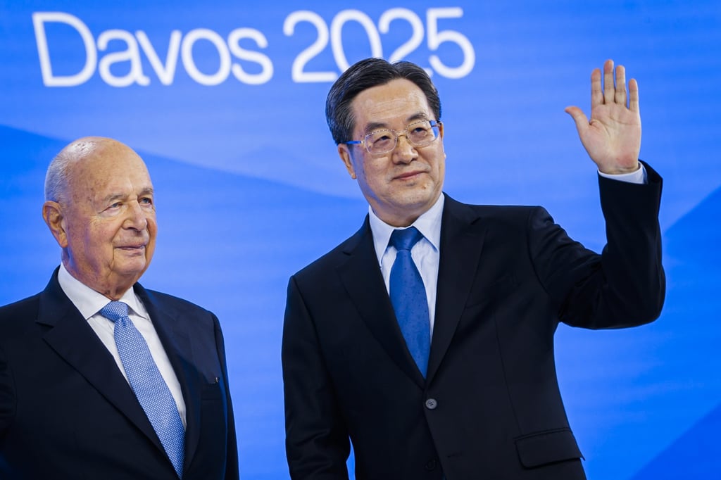 世界经济论坛创始人克劳斯·施瓦布(左)与丁薛祥同台。照片:EPA-EFE