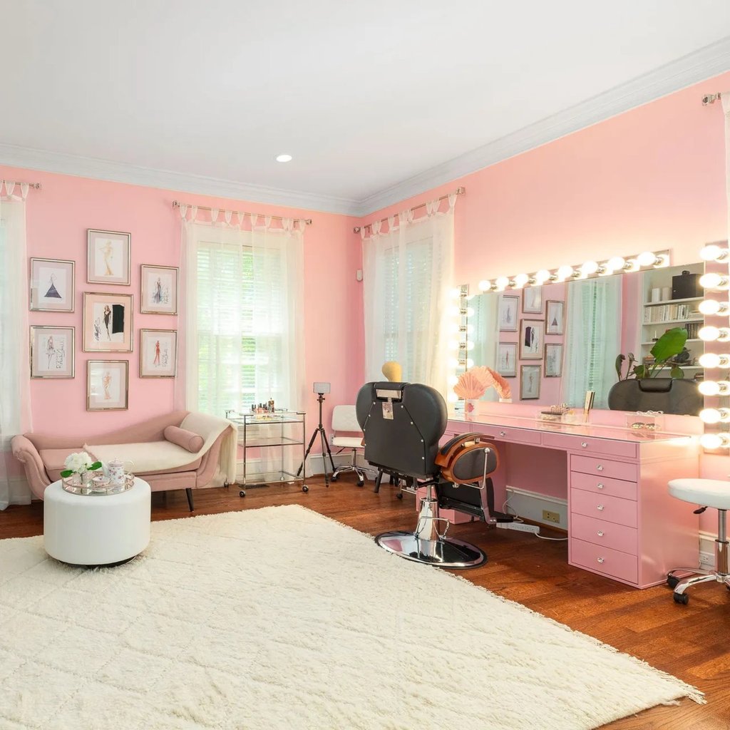 没有人比卡戴珊家族更懂化妆间。由马丁·劳伦斯·布拉德设计,这些空间已成为姐妹们的专属美容圣殿。从定制收纳到红毯级灯光,每个细节都经过精心考量。布拉德的匠心在科勒·卡戴珊的化妆间尤为突出:镜面包墙捕捉每个角度,灯泡环绕的梳妆台营造好莱坞级别的光彩。而大胆选择女王凯莉·詹娜的化妆空间则陈列着价值2万美元的芭比画作、霓虹灯牌与口红色墙纸,充满混搭趣味与鲜明个人风格。广告