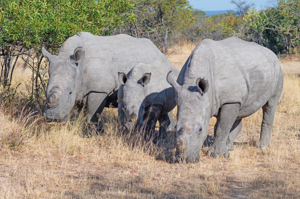 马托博国家公园里,一个犀牛家庭正在吃草。照片:Shutterstock