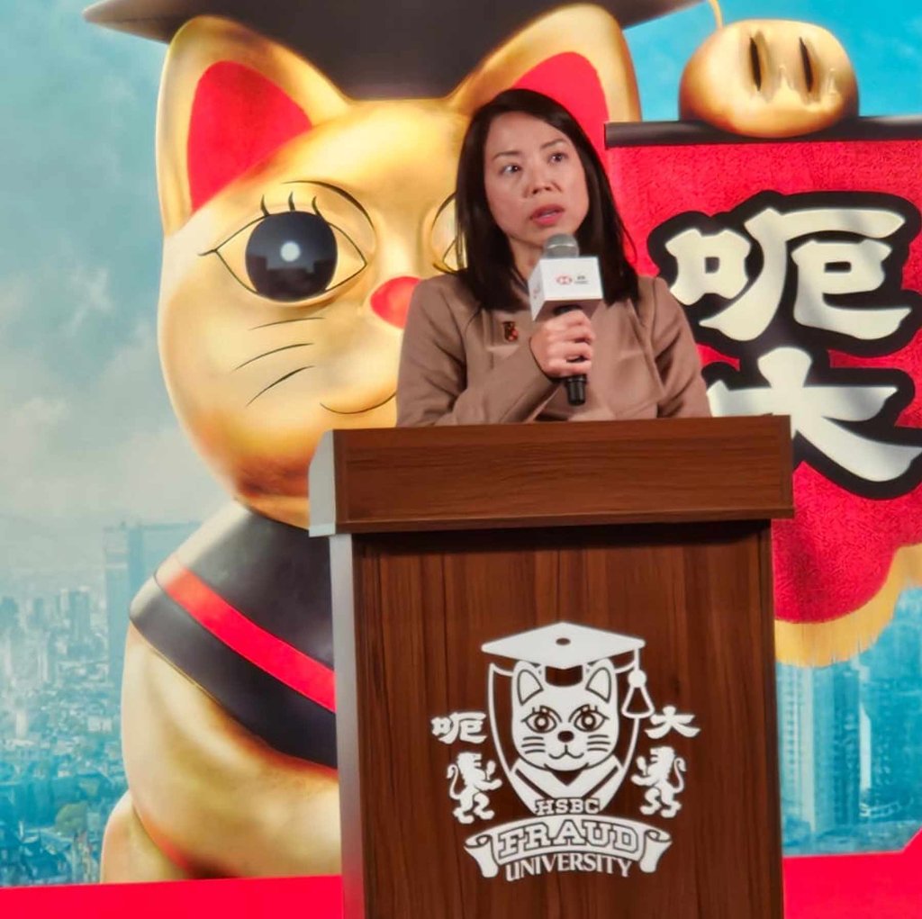 2025年1月23日,汇丰香港行政总裁林慧虹在"反诈大学堂"展览启动仪式上发言。摄影:Leopold Chen