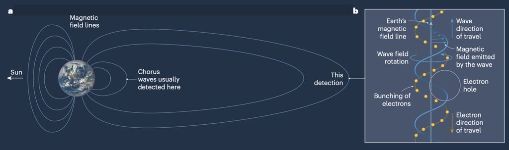 通过美国宇航局磁层多尺度任务(MMS)卫星,团队确认这些波动源自地球被极度拉长的磁场线——外太空带电粒子持续撞击这些磁场线,其原理类似拨动乐器琴弦。当转化为音频时,合声波呈现出类似黎明时分鸟鸣的声音。英国南极调查局空间气象专家理查德·霍恩称此发现为"意外区域的惊人成果",并指出该研究将帮助科学家更好地理解与预测深空中的此类辐射现象。未参与该研究的霍恩在随刊评论中写道:“合声波能将电子加速至接近光速…这些高能电子被称为’杀手电子’,它们已导致多颗卫星受损,造成数亿美元损失。”