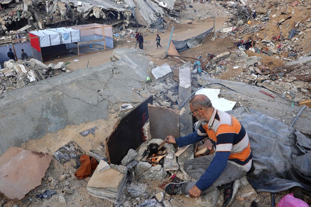 周四,在以色列与哈马斯停火期间,一名男子在加沙地带北部杰巴利耶的废墟上准备咖啡,流离失所的巴勒斯坦人返回该地区。图片来源:法新社