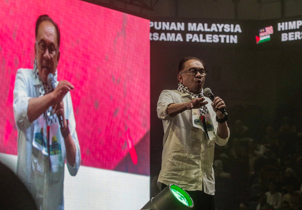 马来西亚总理安瓦尔·易卜拉欣在2023年10月一场声援巴勒斯坦人民的集会上发表讲话。马来西亚长期以来一直支持巴勒斯坦。照片:EPA-EFE