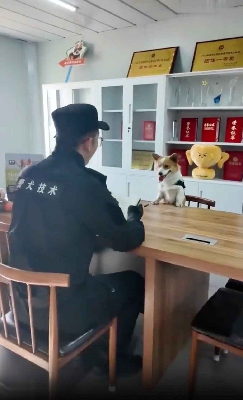 柯基警犬福仔与训导员在警队开会。图源:抖音