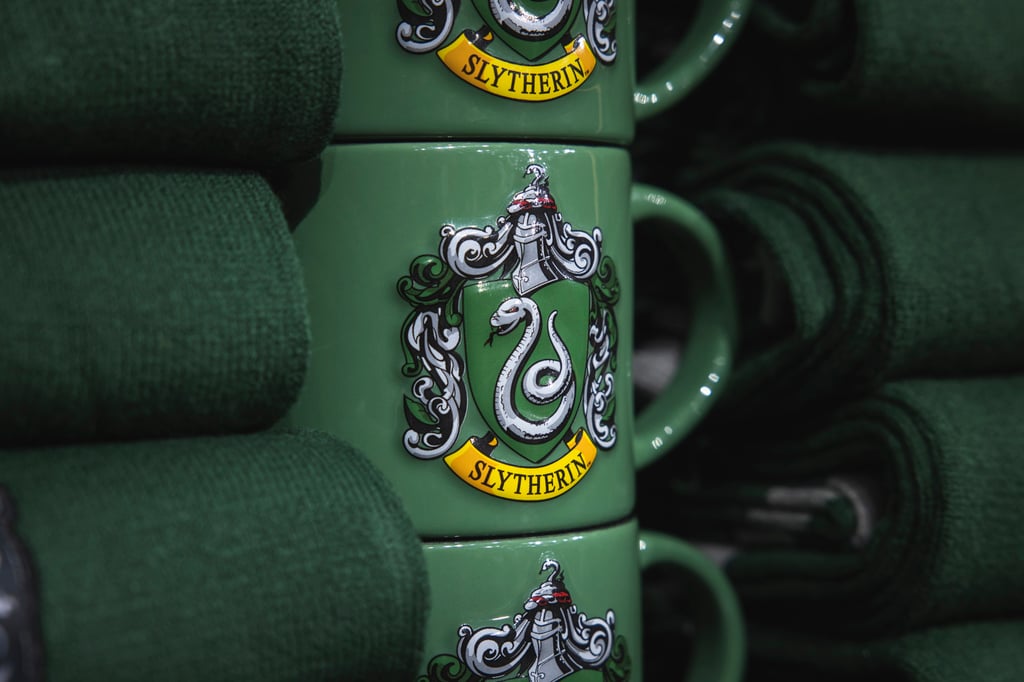 西班牙巴塞罗那巡回哈利波特主题展商店中印有斯莱特林标志的杯子。图片来源:盖蒂图片社