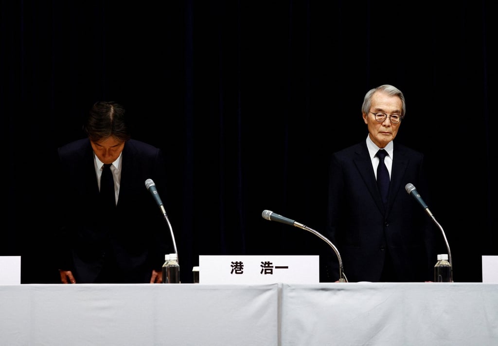 2025年1月27日,日本东京,富士电视台总裁港浩一(左)和董事长加纳修二在新闻发布会上鞠躬。照片:路透社