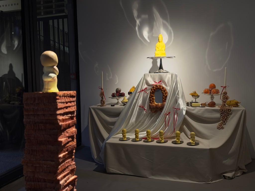 面包象征生命、黄油代表精神慰藉的概念在后侧展厅呈现——一个黏土制作的祈祷孩童雕像立于烤面包柱上,正对香港人俗称"观音"的慈悲女神黄油雕塑。
