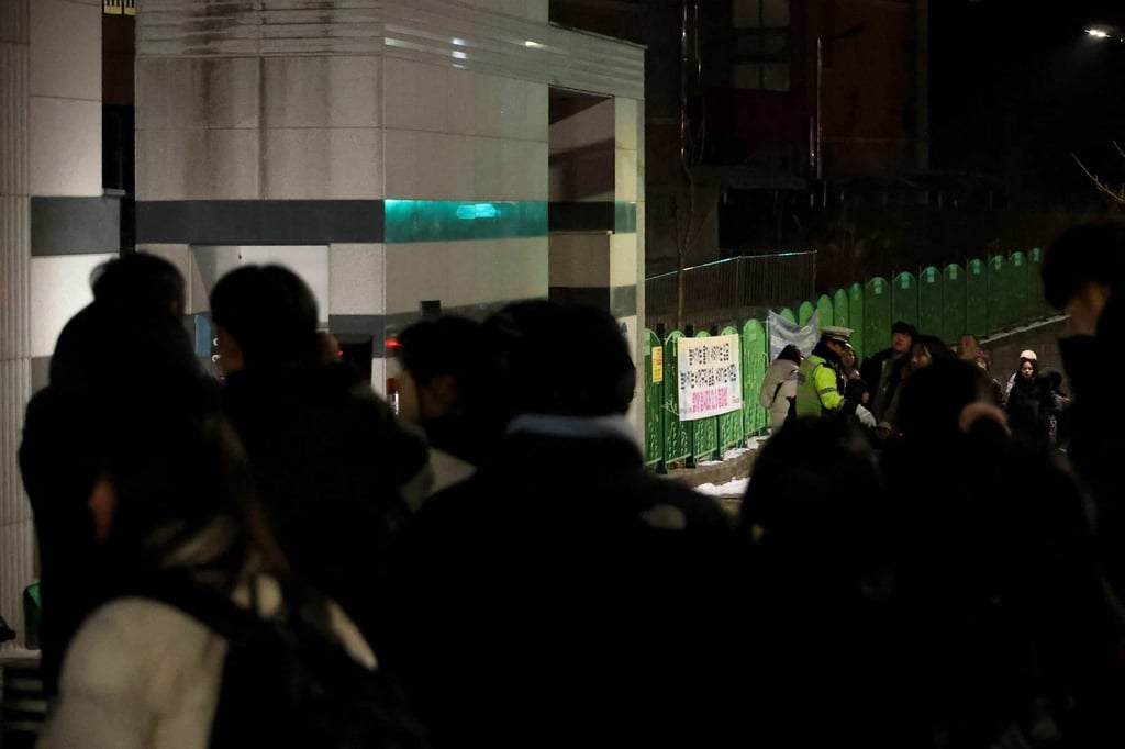 周一晚间民众聚集在大田市事发校舍外。图片来源:韩联社/法新社