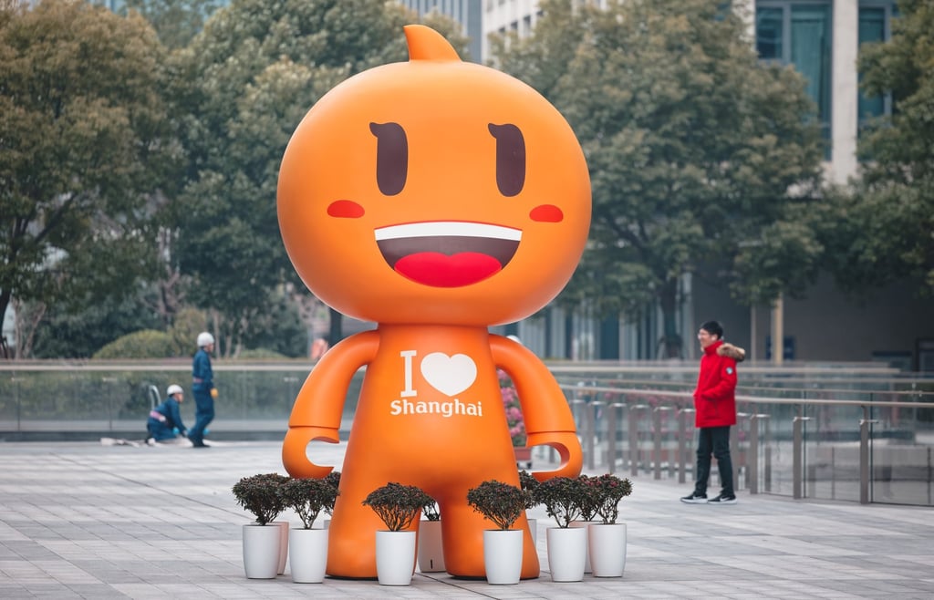 2月12日,行人经过上海阿里巴巴中心门前的阿里吉祥物。图片来源:EPA-EFE
