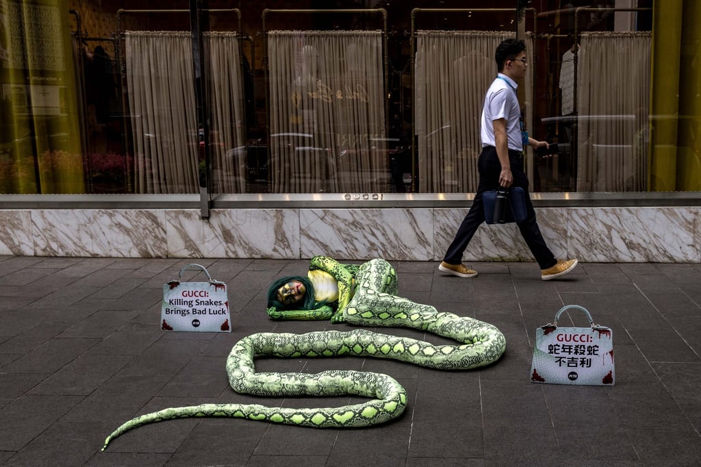 上个月,来自善待动物组织(PETA)的一位动物权利活动家在吉隆坡一家古驰店前抗议。照片:德新社