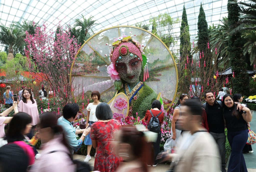 1月24日新加坡滨海湾花园农历新年主题展上,不同背景的游客们正与核心展品《白蛇传》花卉雕塑合影。普通话与新加坡式英语使用者有时也能实现奇妙沟通。图:EPA-EFE