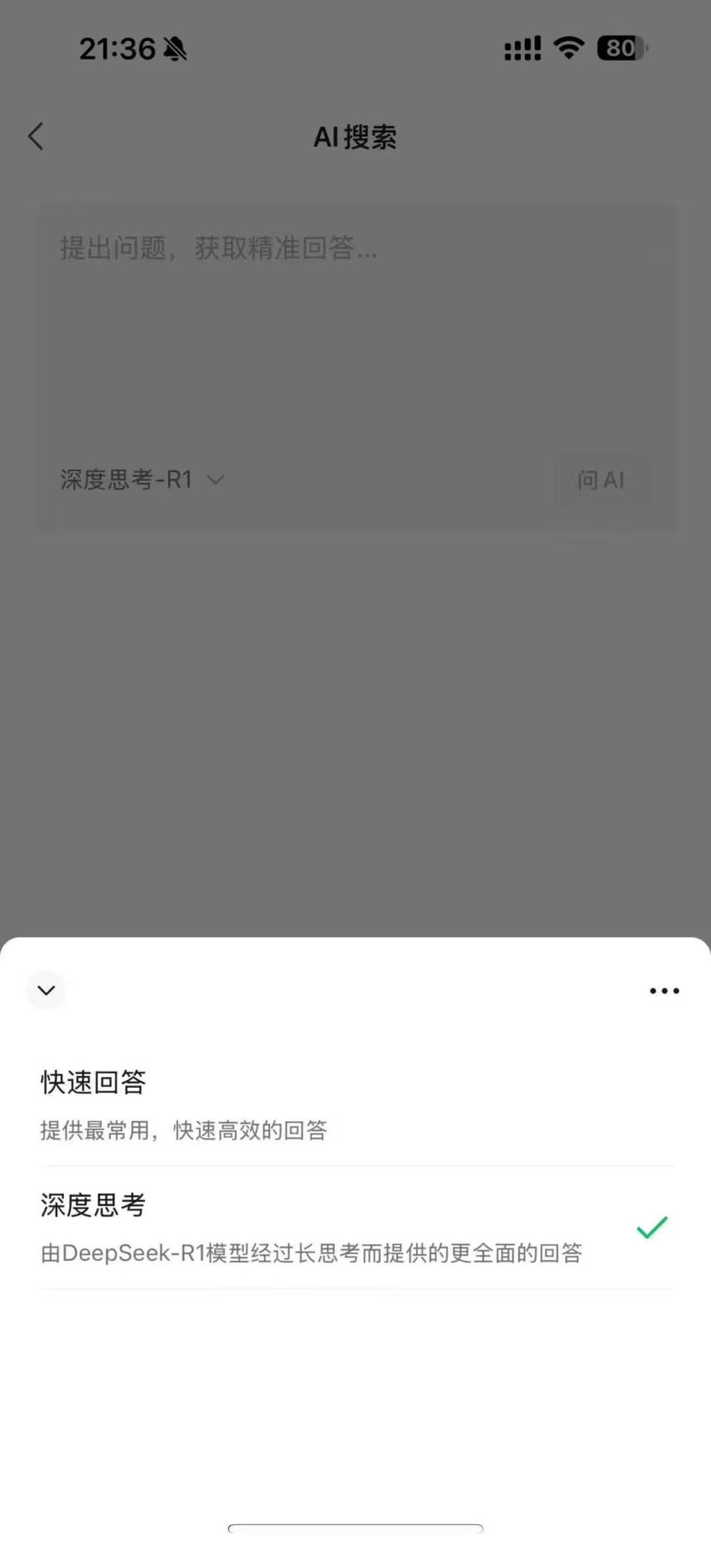 2025年2月16日,微信中国大陆测试版中深度求索AI搜索功能的截图。图片来源:供图