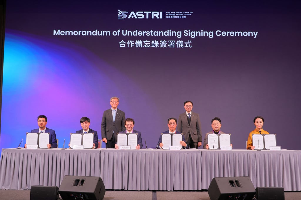 在香港特别行政区政府引进重点企业办公室主任甄先生(站立,左)和香港应用科技研究院主席李工程师(站立,右)的见证下,署理行政总裁兼首席运营官钟工程师(就座,右三)分别与深智城数字科技(香港)有限公司、ConnectX科技有限公司,以及法国Prophesee公司、韩国智慧城市协会和香港西井科技有限公司的代表签署了谅解备忘录,为未来跨行业技术转移奠定了坚实基础。