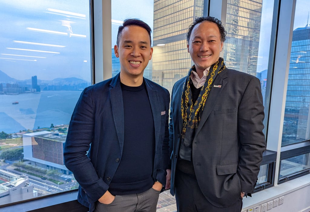 2月13日,共识大会香港站主席刘昌汉(左)与香港投资推广署金融服务及金融科技主管梁瀚璟在中环投资推广署办公室合影。摄影:Matt Haldane