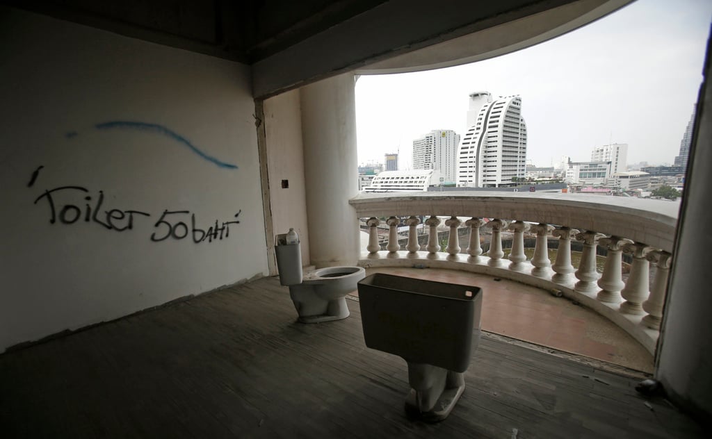 2017年,泰国曼谷废弃的沙吞独特大楼内,独立马桶散落在空旷房间中。图片来源:美联社
