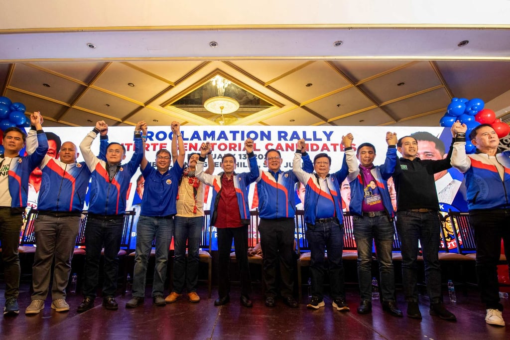 2025年2月13日,菲律宾前总统罗德里戈·杜特尔特(中)与其PDP-Laban党的参议员候选人在中期选举前的提名集会上做手势。照片:法新社