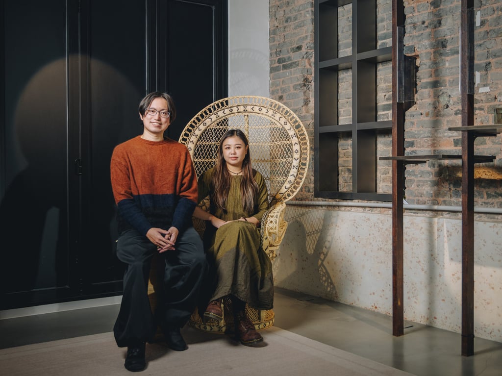 艺术家黎美莲和陈柏纳在Peel工艺坊,与他们为《双重回响》展览设计的两把孔雀椅之一合影。摄影:谭凯琳