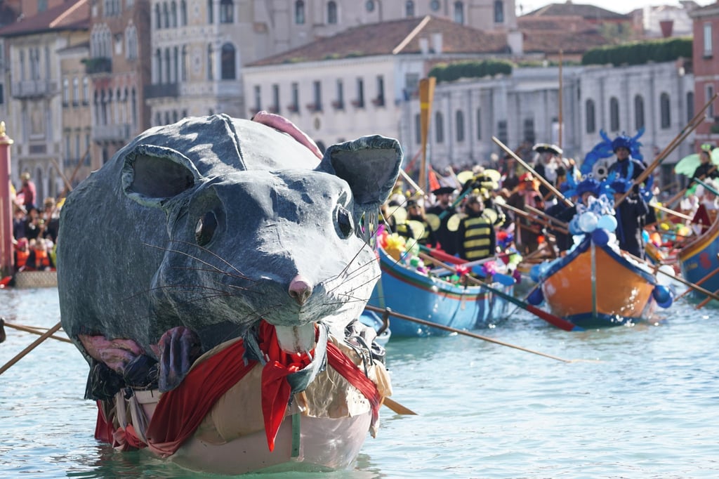 巨大的充气老鼠“Pantegana”带领船队在大运河上巡游,标志着2025年威尼斯狂欢节的开幕,今年的主题是“卡萨诺瓦的时代”。照片:EPA-EFE